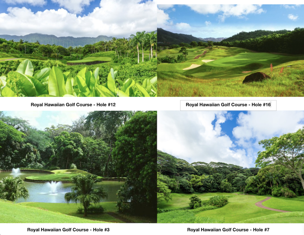 The course is on the island of Oahu on the windward side of the Pali mountains. The property is close to the mountains and frequent rains create a lush tropical background for some unique and challenging golf holes. One of the things that distinguishes the course is the unique set of par 3 holes. Here is a picture of the four par 3s.